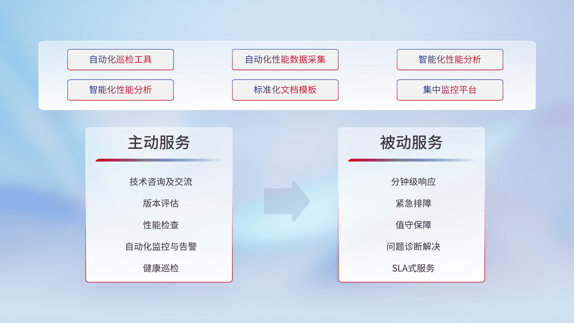 智能化工具和标准化文档,,保障服务质量,,,,提供主动服务(包含技术咨询、、、、版本评估、、、性能检查、、、、自动化监控与告警、、、、健康巡检)和被动服务包含(分钟级响应、、、紧急排障、、、值守保障、、、、问题诊断解决、、、SLA服务)。。。
