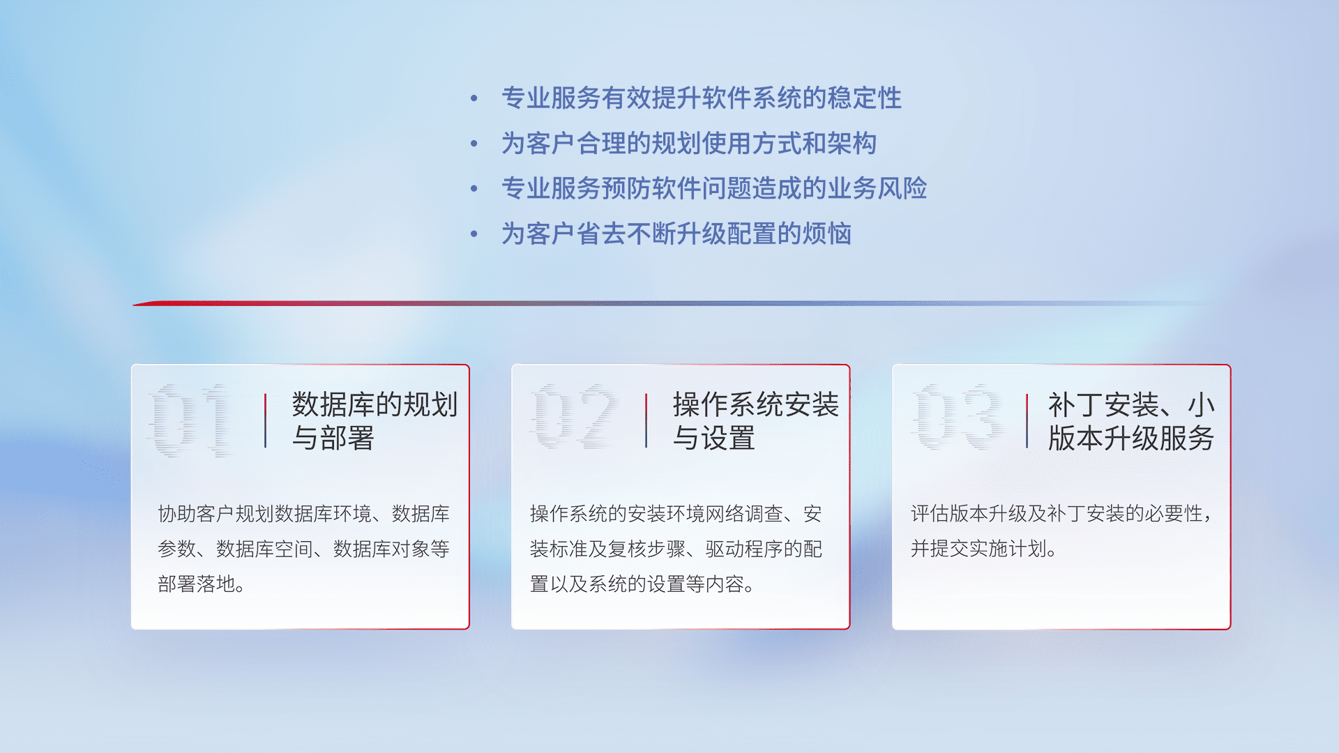 为客户提供软件规模升级、、、、快速部署、、按需配置的专业服务,,,,从数据库的规划与部署到操作系统的安装与设置,,,再到补丁安装和小版本升级提供支持。。。